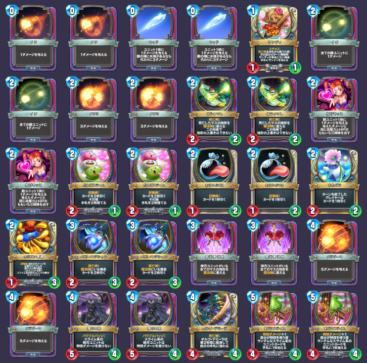 2 | 2 | 3 | パワフルバッジ:スライム系のユニットカードを使う度味方リーダーのHPを1回復 |